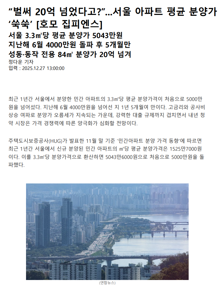최근 서울 분양가는 평당 5,000만원,