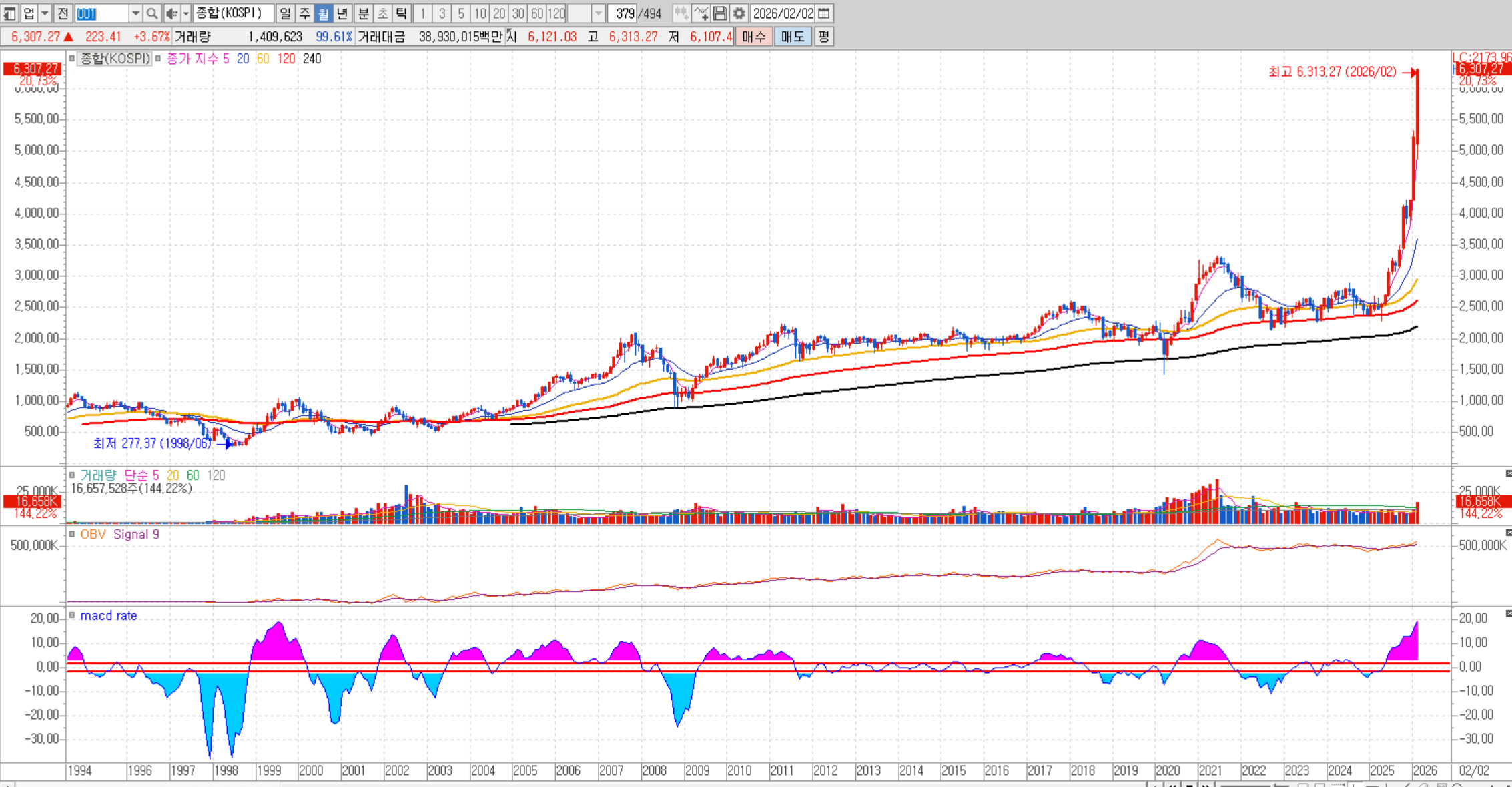 연말부터 지금까지 코스피는 월봉으로 한 달에 1,000pt씩 올리는 기형적인 상승을 이어가며, 오늘 기준 6,300pt를 찍음