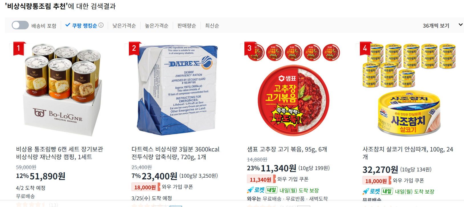 - 통조림, 휴지, 라면, 건어물 (+건빵), 에너지바,고열량 제품