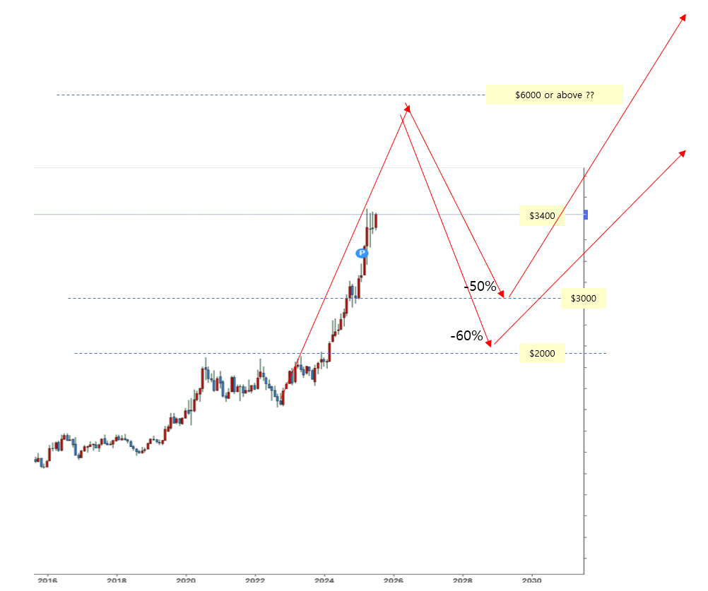 - -50~60% → 공포 매도 유도 . 이후 1~2년 횡보 (중국인들 금 토해내게 할것)