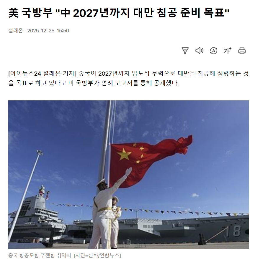 하기 기사를 보면 미 국방부 연례 보고서에 27년 중에 D-Day가 온다고 한다.